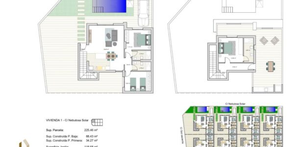 Er is keuze tussen twee verschillende modellen, een gelijkvloerse villa met 2 slaapkamers of een duplex villa met 3 slaapkamers in twee verdiepingen. Beide modellen hebben op het gelijkvloers 2 slaapkamers, 2 badkamers en een ruime leefruimte met open keuken. Boven is er nog een ruim dakterras voorzien met buitenkeuken waar u de hele dag kan genieten van de Spaanse zon. De villa’s in twee verdiepingen hebben nog één slaapkamer met en-suite badkamer extra op het dakterras.